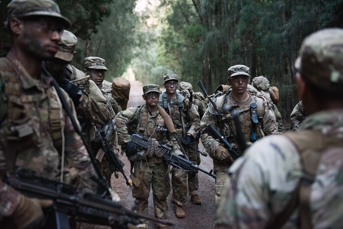 BASE PEARL HARBOR-HICKAM, Hawaii - Ranger Assessment Course students are instructed on the prime locations for an ambush during training near Schofield Barracks, Oahu, Hawaii, May 23, 2019. Twenty-three Airmen from across the Air Force recently converged on a training camp for a three-week Ranger Assessment Course May 12-31, 2019.