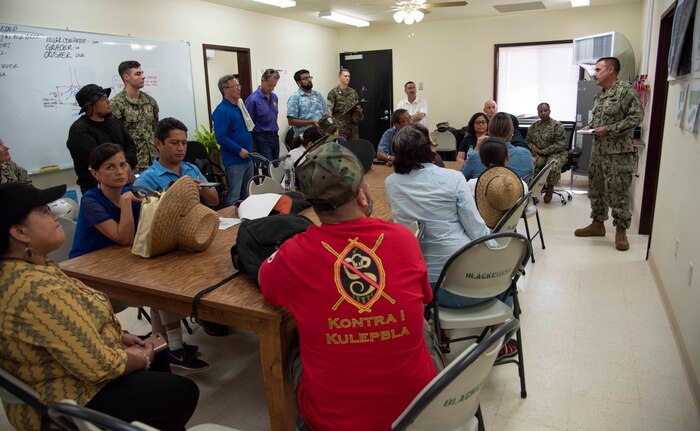 DEDEDO Guam - Cmdr. Brian Foster, executive officer, Officer in Charge of Construction Marine Corps Marianas, provides a safety brief to senators from the 35th Guam Legislature before a site visit at Northwest Field in Dededo July 12. At the request of Sen. Tina Muna Barnes, speaker of the 35th Guam Legislature, Rear Adm. Shoshana Chatfield, commander, Joint Region Marianas and a team of Navy and Marine Corps environmental professionals led a senatorial visit to the site of the endangered Serianthes nelsonii tree at Northwest Field. The group received a briefing from Marine Corps Activity Guam (MCAG) Environmental Director Al Borja and MCAG Natural Resources Specialist Lauren Gutierrez, and saw firsthand the military's commitment to environmental stewardship in the preservation of the island's ecosystem.