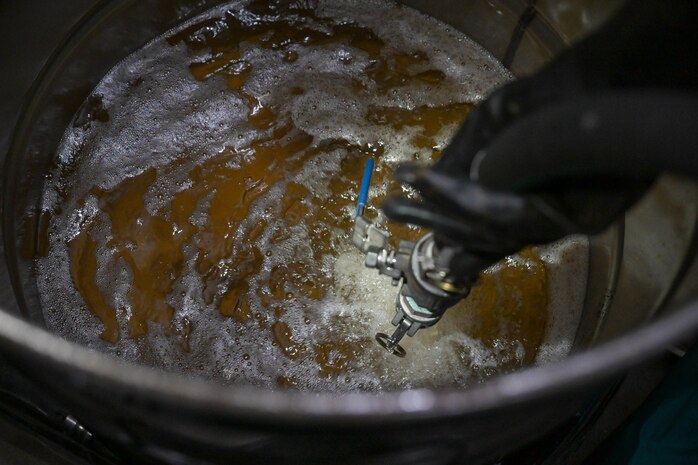 JOINT BASE PEARL HARBOR-HICKAM, Hawaii - Residual fuel is drained into a container at the Underground Pump House located on Joint Base Pearl Harbor-Hickam (JBPHH), Hawaii, March 4, 2024, where personnel are preparing to disconnect the Red Hill Bulk Fuel Storage Facility (RHBFSF) from the Underground Pump House. JTF-RH is now in Defueling Phase 5.B where personnel are focused on removing residual fuel and transitioning with the Navy Closure Task Force - Red Hill (NCTF-RH). The transition will focus on NCTF-RH learning JTF-RH’s processes and procedures for safety, security, and engagement to ensure continuity of operations. During this phase, JTF-RH retains command and control over the RHBFSF Joint Operational Area (JOA) and will synchronize actions to rebuild trust with Federal, State and local stakeholders. (DoD photo by U.S. Army Sgt. ZaBarr Jones)