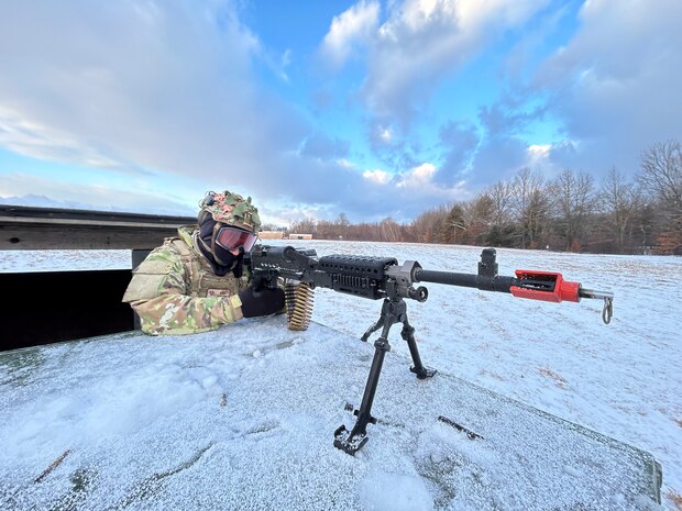 WESTOVER AIR RESERVE BASE, Mass. - Senior Airman Juan Mata, security forces specialist with the 521st Contingency Response Squadron, mans a defensive fighting position during exercise PACIFIC DAGGER Feb. 7, 2025, at Westover Air Reserve Base, Mass. The 621st Contingency Response Wing designed the exercise to test the unit’s airfield-opening mission, adding cold weather as an additional challenge. (U.S. photo by Master Sgt. Tristan McIntire)
