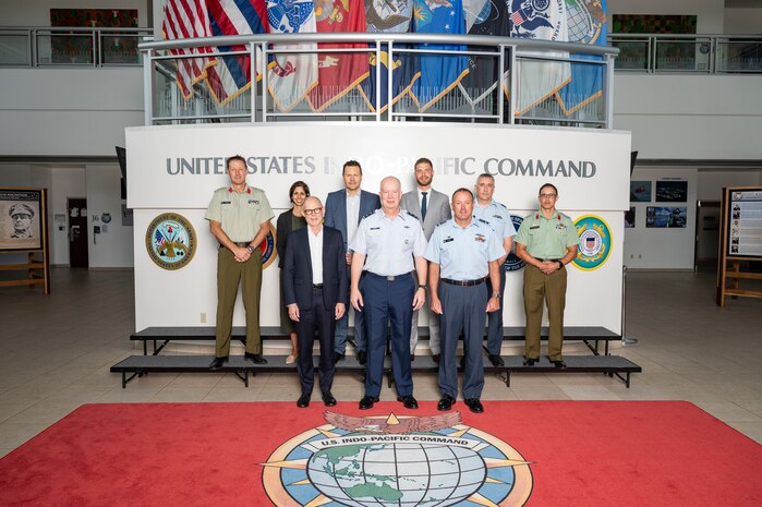HONOLULU, Hawaii - U.S. Air Force Maj. Gen. Joel Carey, front center, chief of staff of U.S. Indo-Pacific Command joins New Zealand Secretary of Defence Brook Barrington, front left, and Chief of Defence Force Air Marshal Tony Davies, front right, for a group photo at USINDOPACOM headquarters on Camp H. M. Smith in Honolulu, May 5, 2025. USINDOPACOM is committed to enhancing stability in the Indo-Pacific region by promoting security cooperation, encouraging peaceful development, responding to contingencies, deterring aggression and, when necessary, prevailing in conflict. (U.S. Navy photo by Mass Communication Specialist 1st Class John Bellino)