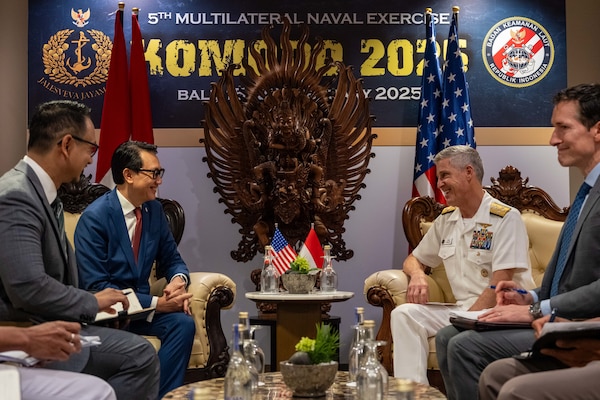 BALI, Indonesia (Feb. 17, 2025) - Adm. Steve Koehler, commander, U.S. Pacific Fleet, right, speaks with Sjafrie Sjamsoeddin, Indonesia’s minister of defense, during the 6th International Maritime Security Symposium (IMSS), held in conjunction with Multilateral Naval Exercise Komodo (MNEK) 2025, in Bali, Indonesia, Feb. 17. The IMSS is the largest international symposium event organized by the Indonesian Navy that brings naval leaders from around the world to discuss the latest maritime issues. (U.S. Navy photo by Mass Communication Specialist 1st Class Caroline H. Lui)