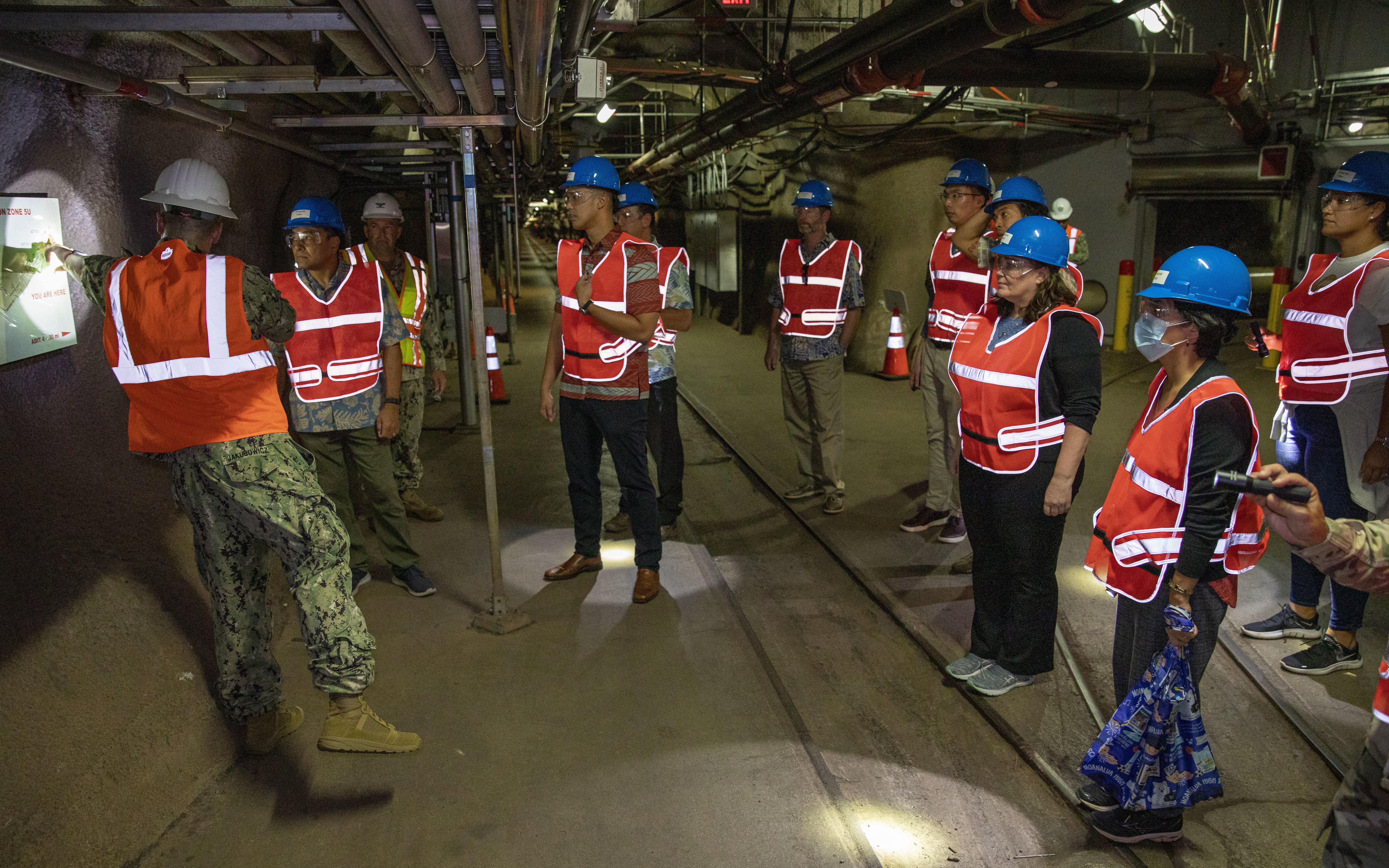 Defense Logistics Agency Energy East-Pacific Commander, U.S. Navy Cmdr. William Jakubowicz, guides the House Special Committee to Red Hill (HSCRH) during a tour of the Red Hill Bulk Fuel Storage Facility in Halawa, Hawaii, April 12, 2023. The visit provided the HSCRH and Mr. Luke Meyers of the Governor’s Water Committee an opportunity to meet with key leaders on the status of Red Hill including defueling, closure and remediation. The HSCRH is a seven-member committee whose purpose is to address issues related to Red Hill, water contamination and remediation, and all related impacts. The governor’s committee monitors the progress on the Red Hill timeline and provides the people of Hawaii with regular updates and status reports. (U.S. Army photo by Spc. Matthew Mackintosh)