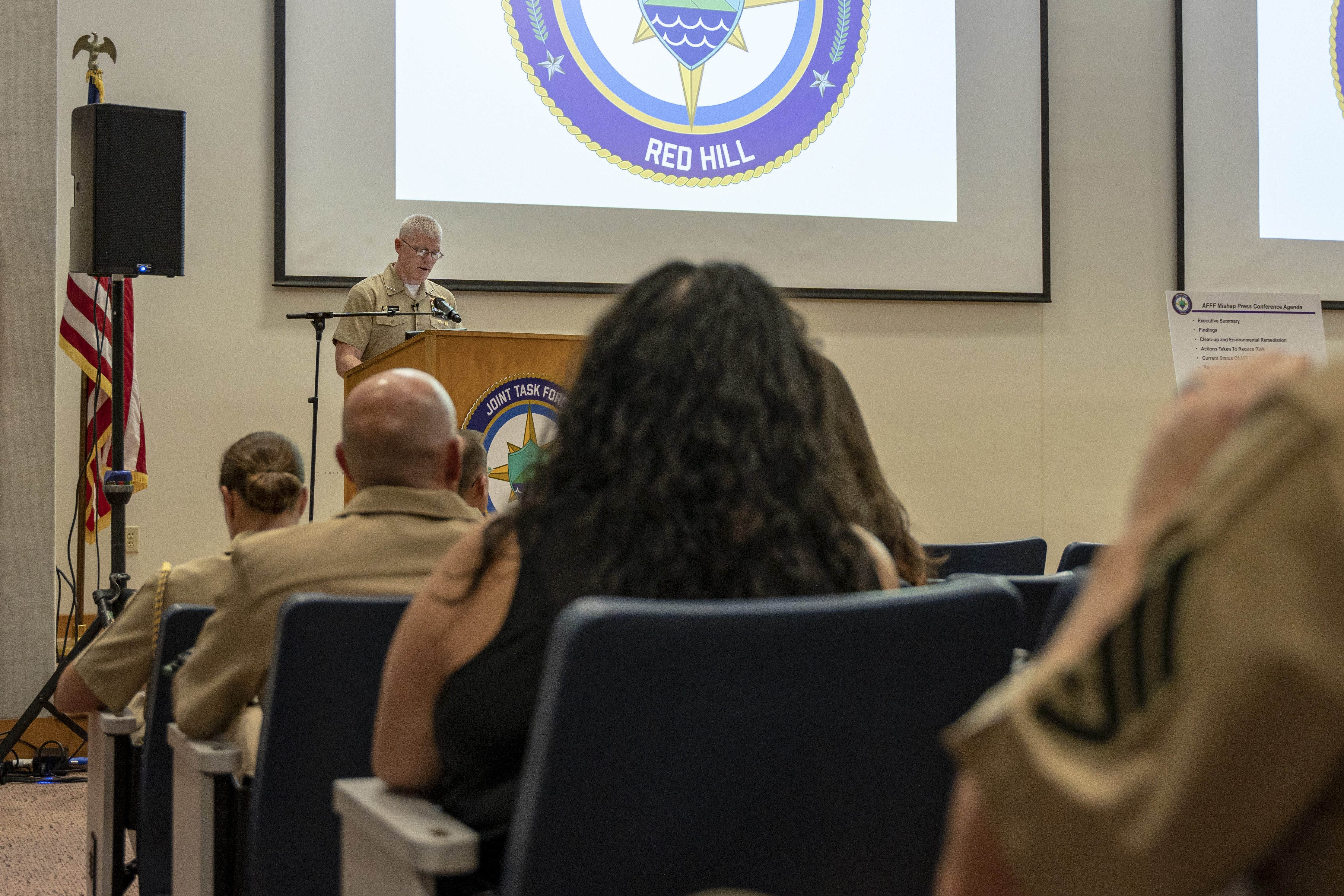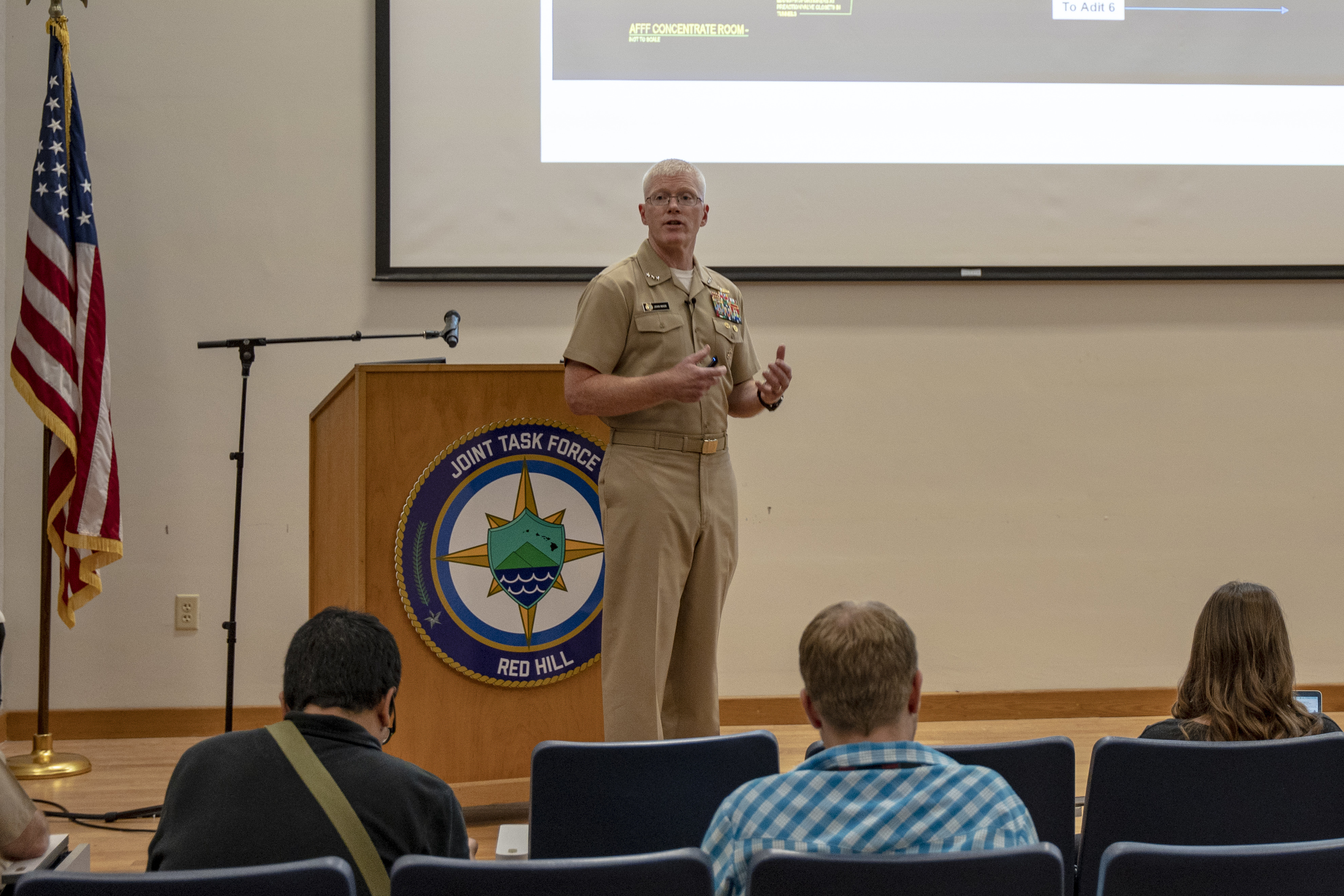 Joint Task Force-Red Hill (JTF-RH) commander, U.S. Navy Vice Adm. John Wade, briefs local media during a press conference held at Joint Base Pearl Harbor-Hickam, Hawaii, May 5, 2023. JTF-RH announced the findings from the investigation of the Nov. 29 Aqueous Film Forming Foam (AFFF) concentrate release at the Red Hill Bulk Fuel Storage Facility today and published video footage of the incident and a fact sheet. “I ordered this investigation to determine what caused the accidental release of AFFF concentrate and to reduce the risk of a future mishap,” said JTF-RH commander Vice Adm. John Wade. “A focused investigation allowed us to effectively determine how and why the release occurred. We used this information to immediately implement risk reduction measures across the entire facility and to notify the Department of Defense of actions that can be taken to further reduce risk in areas outside the purview of JTF-RH. The safe and expeditious defueling of Red Hill remains our top priority to protect the people and environment of Hawaii.” (U.S. Navy photo by Mass Communication Specialist 2nd Class James Finney)
