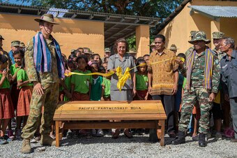 DILI, Timor-Leste (June 23, 2014) - Irene Soares, director of the Farol Primary School in Dili, cuts the ribbon to a newly-constructed restroom during a ceremony in support of Pacific Partnership 2014. Pacific Partnership is in its ninth iteration and is the largest annual multilateral humanitarian assistance and disaster relief preparedness mission conducted in the Asia-Pacific region.
