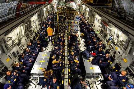In this photo file, Sixty-nine members of the Fairfax County Urban Search and Rescue Team await takeoff on a U.S. Air Force C-17 Globemaster III at Dover Air Force Base, Del., April 26, 2015. The specially trained team and approximately 70,000 pounds of their supplies are deploying to Nepal to assist with rescue operations after the country was struck by a 7.8-magnitude earthquake.