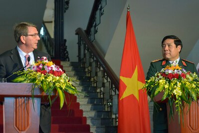 HANOI, Vietnam (June 1, 2015) - Defense Secretary Ash Carter, left, and Vietnamese Defense Minister Gen. Phung Quang Thanh hold a news conference. Carter is on a 10-day trip to meet with Asia-Pacific partner nations and affirm the U.S. commitment to the region.
