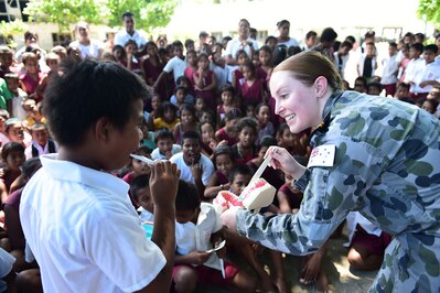 TARAWA, Kiribati (June 8, 2015) - Royal Australian Navy Lt. Emma Thornburn teaches kids proper tooth brushing techniques at the Dai Nippon Primary School in Betio, Kiribati, during Pacific Partnership 2015. The program was offered by host nation and military dental providers from Australia, New Zealand and the U.S. and is one of the many professional knowledge exchanges that are taking place during this year's Pacific Partnership mission. Now in its 10th iteration, Pacific Partnership is the largest annual multilateral humanitarian assistance and disaster relief preparedness mission conducted in the Indo-Asia-Pacific Region. While training for crisis conditions, Pacific Partnership missions have provided medical care to approximately 270,000 patients and veterinary services to more than 38,000 animals. Additionally, Pacific Partnership has provided critical infrastructure development to host nations through the completion of more than 180 engineering projects.