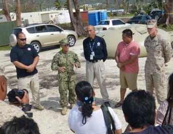 SAIPAN, Northern Mariana Islands (Aug. 22, 2015) - Rear Adm. Bette Bolivar, commander of Joint Region Marianas, speaks with Saipan media during a press conference with Steve DeBlasio, the federal coordinating officer for the Federal Emergency Management Agency, Commonwealth of the Northern Mariana Islands Lt. Gov. Ralph Torres and Lt. Col. Eric Malinowski, liaison for 31st Marine Expeditionary Unit. The press conference addressed the military's involvement in disaster relief efforts in Saipan after Typhoon Soudelor and to announce the departure of the Navy and Marine Corps teams from the island.