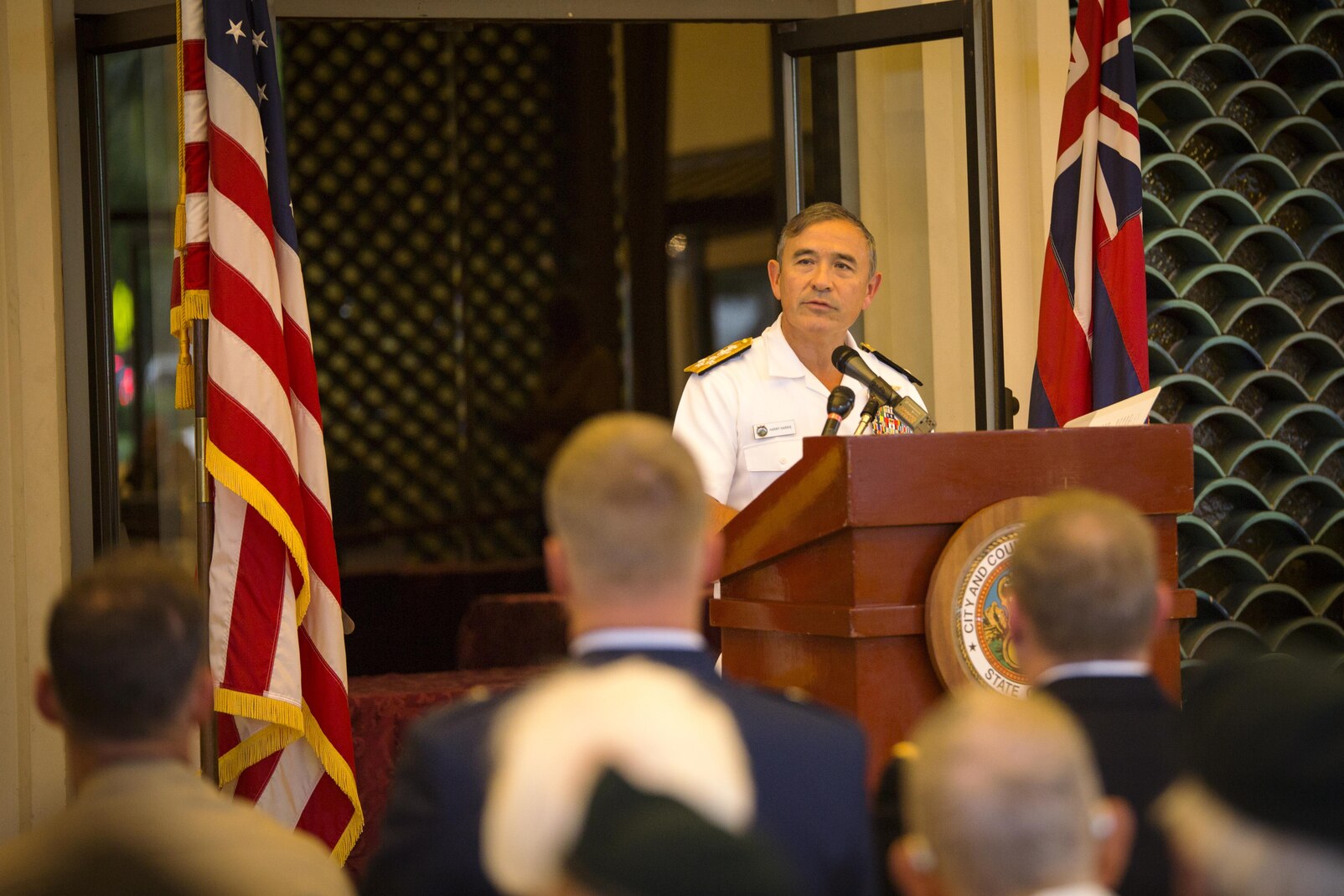 Adm. Harry Harris, U.S. Pacific Command commander, addresses veterans in attendance during the War Memorial Plaque Rededication Ceremony at the Neal S. Blaisdell Center in Honolulu, Nov. 10, 2015. Harris was one of the guest speakers for the ceremony in which he stated, “Any nation that does not honor its heroes will not endure.” The Neal S. Blaisdell Center was dedicated as a war memorial in 1964, but its plaque went missing. The new plaque was dedicated to revitalize and preserve the war memorial heritage. (U.S. Marine Corps photo by Lance Cpl. Jonathan E. LopezCruet)