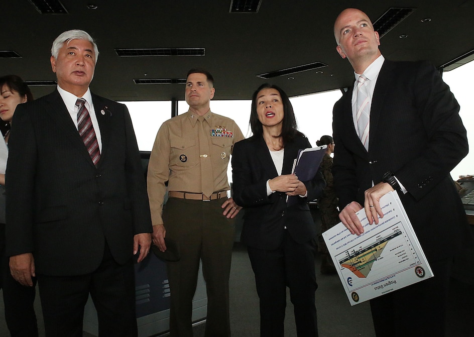 From left to right. Gen Nakatani, Japanese Defense Minister, tours the air traffic control tower with Col. Robert V. Boucher, commanding officer of Marine Corps Air Station Iwakuni, Japan, Yoko Seo, technical information specialist with protocol at Headquarters and Headquarters Squadron, and Brian Wottowa, director of Iwakuni's Integrated Program Management Office for the Defense Policy Review Initiative, during a station visit, Dec. 2, 2015. Station officials welcomed Nakatani before touring VMGR-152 and the air traffic control tower. This visit built a stronger bilateral understanding between station personnel and Japanese officials.