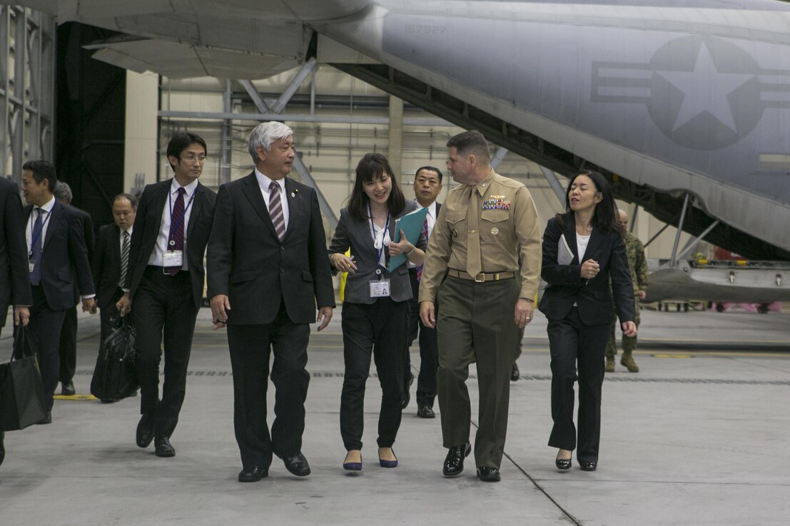 Gen Nakatani, Japanese Defense Minister, tours Marine Aerial Refueler Transport Squadron (VMGR) 152 facilities during his visit to Marine Corps Air Station Iwakuni, Japan, Dec. 2, 2015. Station officials welcomed Nakatani before touring VMGR-152 and the air traffic control tower. This visit built a stronger bilateral understanding between station personnel and Japanese officials. (U.S. Marine Corps photo by Cpl. Carlos Cruz Jr./Released)