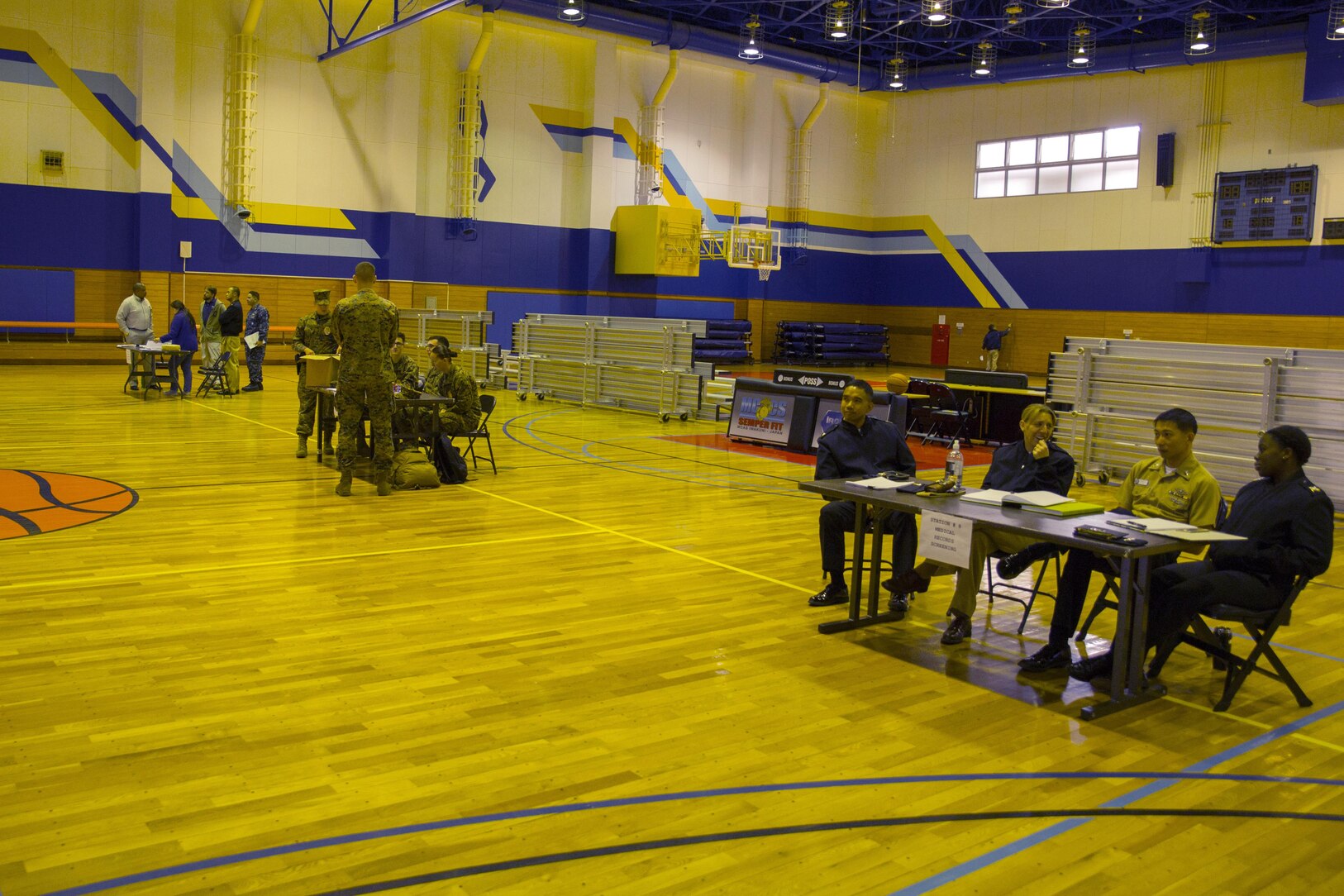 Station residents provide required information to the Navy and Marine Corps Relief Society, and American Red Cross during a noncombatant evacuation processing center exercise in the IronWorks Gym at Marine Corps Air Station Iwakuni, Japan, Dec. 11, 2015. This exercise practices evacuating endangered personnel in a host foreign nation to a safe location. An evacuation can take place for a variety of reasons such as natural disasters, industrial accidents and military threats.