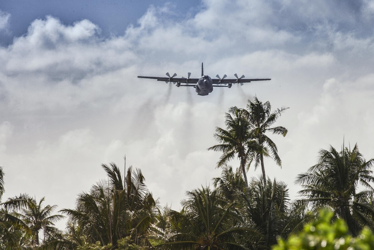 A C-130 Hercules from the 36th Airlift Squadron flies over Fais Island, Dec. 8, 2015, during Operation Christmas Drop 2015. Airmen from the Yokota delivered over 800 pounds of supplies to the island of Fais during Operation Christmas Drop 2015. This year marks the first ever trilateral Operation Christmas Drop where the U.S. Air Force, Japan Air Self-Defense Force and the Royal Australian Air Force work together to provide critical supplies to 56 Micronesian Islands. (U.S. Air Force photo by Osakabe Yasuo/Released)