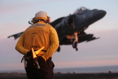 USS BOXER, PACIFIC OCEAN (Dec. 3, 2015) - A U.S. Navy Sailor with the Boxer Amphibious Ready Group prepares to signal directions to the pilot of an AB-8B Harrier after it lands on the flight deck of the USS Boxer during flight operations, Dec. 3, 2015. The Boxer Amphibious Ready Group is underway off the coast of Southern California completing a certification exercise. CERTEX is the final evaluation of the 13th Marine Expeditionary Unit and Boxer ARG prior to deployment and is intended to certify their readiness to conduct integrated missions across the full spectrum of military operations. (U.S. Marine Corps photo by Sgt. Paris Capers/ RELEASED)