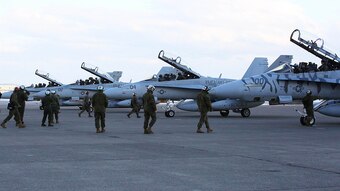 Maintainers with Marine All-Weather Fighter Attack Squadron (VMFA) 224 approach F/A-18D Hornets that arrived from Marine Corps Air Station Iwakuni to Chitose Air Base in Hokkaido, Japan, Jan. 12, 2016. VMFA (AW)-224, homebased at MCAS Beaufort, S.C., is temporarily based in Iwakuni on a unit deployment program and deployed to Northern Japan to participate in the Chitose Aviation Training Relocation Exercise Jan. 12-22. During the exercise, the squadron conducted dissimilar air combat training with and against the Japan Air Self-Defense Force to further support combined interoperability and Pacific theater security cooperation. (U.S. Marine Corps photo by Cpl. Jessica Quezada/Released)