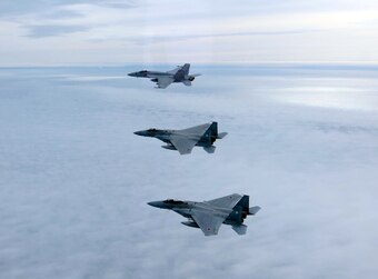 KANAGAWA, Japan (April 13, 2016) - Cmdr. Guy Snodgrass, (top middle), leads members of the Japan Air Self-Defense Force (JASDF), 305th Tactical Fighter Squadron, during a week-long Benkyoukai exercise in an effort to increase operational effectiveness between the U.S. Navy and JASDF. The dissimilar air combat training provided pilots of JASDF's 305th Tactical Fighter Squadron with the opportunity to fly their F-15J Eagles against a VFA-195's F/A-18E Super Hornet.