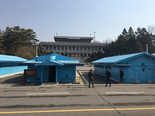 South Korean Soldiers stand guard on the South Korean side of the Joint Security Area March 26, near the United Nations Command Military Armistice Commission conference building, as Soldiers from the 1st Armored Brigade Combat Team, 1st Cavalry Division, visit the room where international negotiations take place with one of the most secluded nations on Earth.