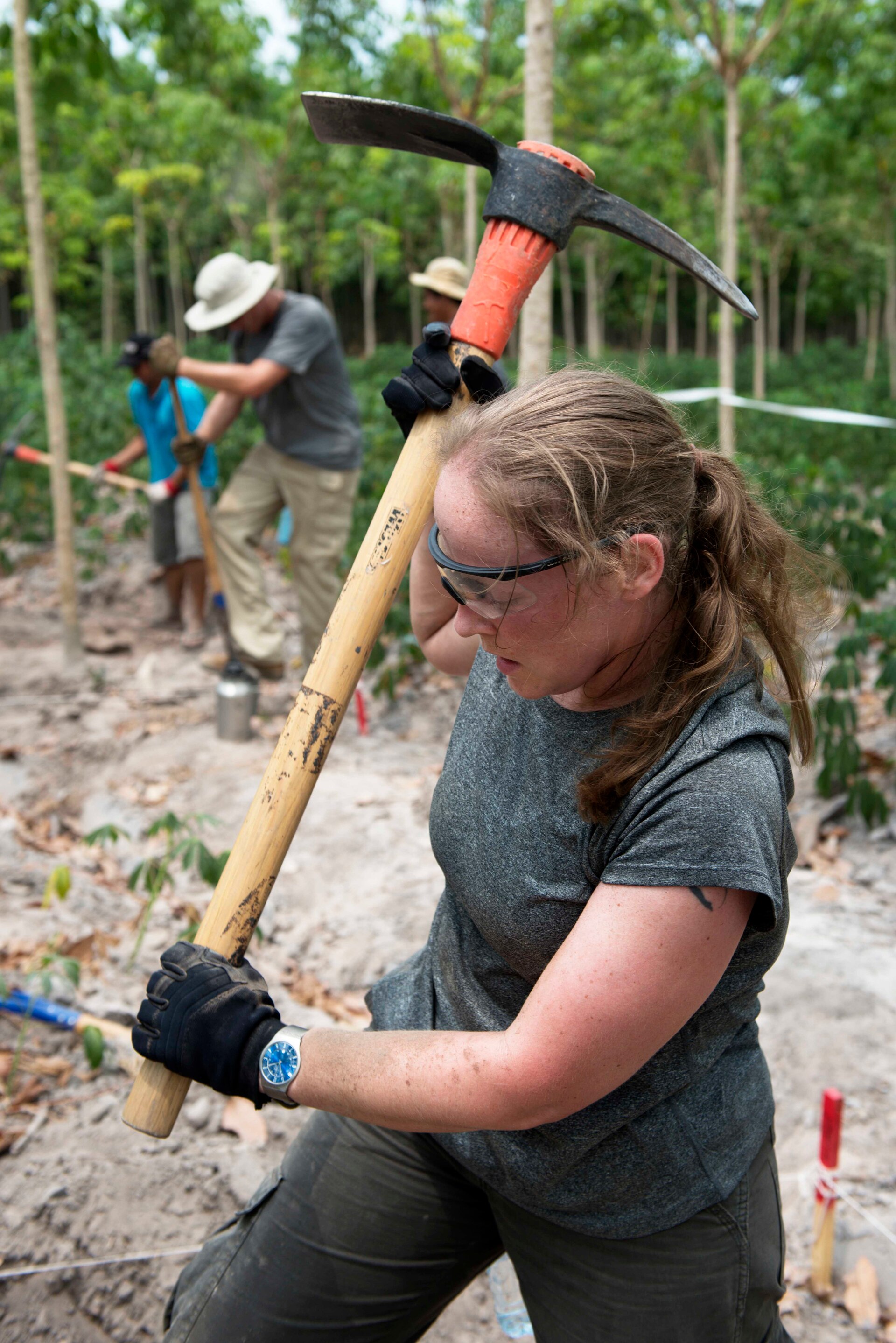 U.S. Army Staff Sgt. Samantha Brenneman, Defense POW/MIA Accounting Agency (DPAA) augmented recovery noncommissioned officer, wields a pick axe at an excavation site Tay Ninh Province, Vietnam, March 17, 2016. Brenneman is a mortuary affairs specialist assigned to the 2nd Brigade Support Battalion, 2nd Stryker Brigade Combat Team, 2nd Infantry Division stationed at Joint Base Lewis-McChord, Washington. She is part of a specialized team deployed by DPAA in search of two service members lost in an L-19 aircraft crash in 1967. DPAA’s mission is to provide the fullest possible accounting for our missing personnel to their families and the nation. (DoD photo by Tech. Sgt. Kathrine Dodd, U.S. Air Force/RELEASED)