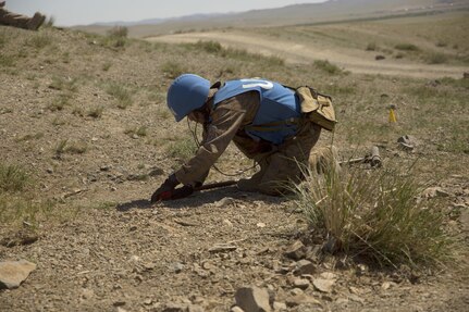 A soldier with the Mongolian Armed Forces probes for mines while participating in a mine clearnace and counter-IED training course during Khaan Quest 2016 at Five Hills Training Area near Ulaanbaatar, Mongolia, June 1. The training provided MAF members with the skills to safely identify and mark potential threats in a minefield, extract personnel and vehicles from minefields and develop IED awareness. Khaan Quest 2016 is an annual, multinational peacekeeping operations exercise hosted by the Mongolian Armed Forces, co-sponsored by U.S. Pacific Command, and supported by U.S. Army Pacific and U.S. Marine Corps Forces, Pacific. Khaan Quest, in its 14th iteration, is the capstone exercise for this year’s Global Peace Operations Initiative program. The exercise focuses on training activities to enhance international interoperability, develop peacekeeping capabilities, build to mil-to-mil relationships, and enhance military readiness. (U.S. Marine Corps Photo by Cpl. Janessa K. Pon)