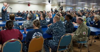 DILI, Timor Leste (June 9, 2016) - Rear Adm. Charles Williams, commander, Task Force 73, addresses the crewmembers of hospital ship USNS Mercy (T-AH 19), which is currently in Timor Leste supporting Pacific Partnership 2016. This year marks the sixth time the mission visited Timor Leste since its first visit in 2006. Medical, engineering and various other personnel embarked aboard Mercy will work side-by-side with partner nation counterparts, exchanging ideas, building best practices and relationships to ensure preparedness should disaster strike.