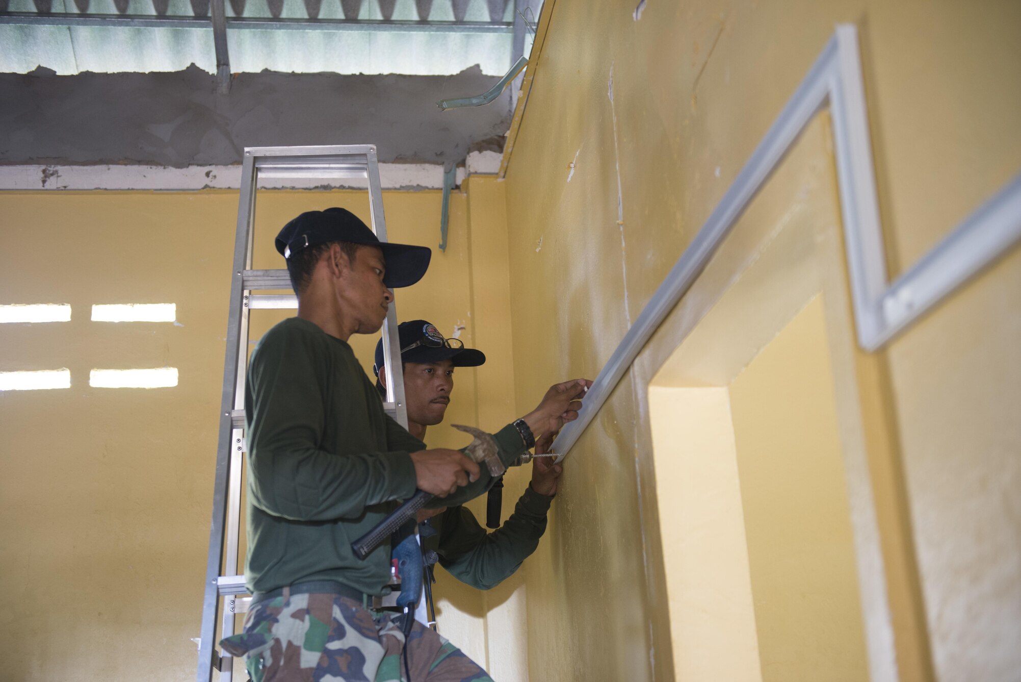 Cambodian Armed Forces Sgt. Nget Sytha and Sgt. Ngin Samnang, Royal Cambodian engineers fit the wall of a health center for electrical cables during Pacific Angel 16-2, June 16, 2016, in Kampot Province, Cambodia. Pacific Angel is a humanitarian assistance/civil military operation missions that builds partner capacity through medical/health outreach, engineering civic projects and subject matter exchanges. (U.S. Air Force photo by Senior Airman Omari Bernard/Released)