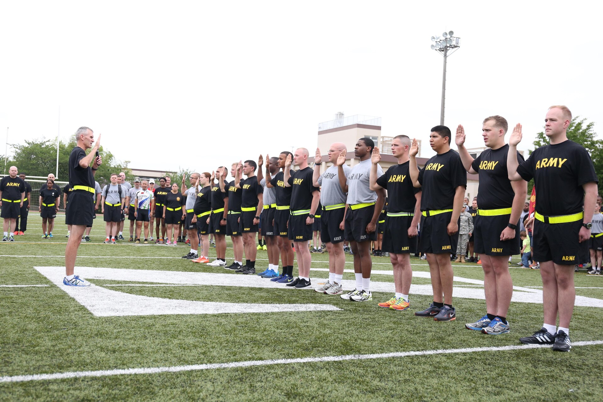 Fourteen Soldiers take the Army’s oath of enlistment with Maj. Gen. James F. Pasquarette, commanding general of USARJ, during a mass reenlistment ceremony held June 17 on the ZAHS football field for Camp Zama’s Army Birthday Week celebration. (U.S. Army photo by Lance D. Davis)