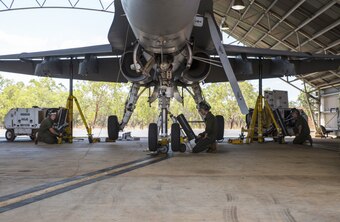 U.S. Marines assigned to Marine Fighter Attack Squadron (VMFA) 122 prepare to lower an F/A-18C Hornet during Southern Frontier at Royal Australian Air Force Base Tindal, Australia, Aug. 31, 2016. In preparation for departure from Australia, the squadron performs maintenance on all aircraft to ensure they are ready to make the long flight home. Southern Frontier is a three week unit level training that helps pilots gain experience and qualifications in low-altitude tactics, close air support, and air ground, high explosive ordnance delivery.