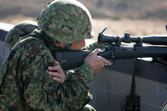 A sniper from the 12th Regiment, Japanese Ground Self-Defense Force aims at a target from atop a shoot house at Yakima Training Center as part of the annual bilateral exercise Rising Thunder, Sept. 8, 2016. The JGSDF service members observed Soldiers from 2nd Battalion, 1st Infantry Regiment, 2-2 Stryker Brigade Combat Team zero from a distance before perform the task themselves.