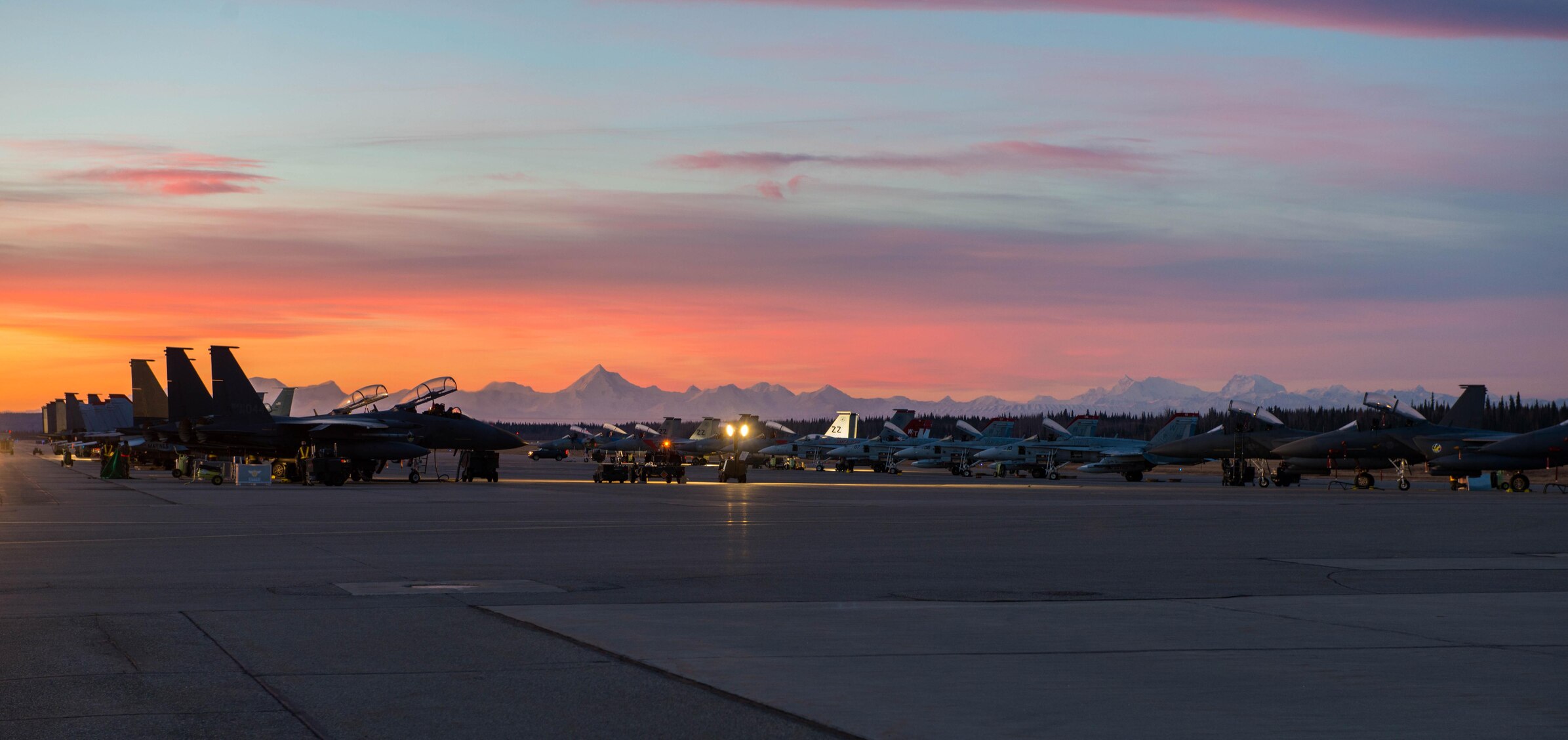 Republic of Korea F-15K Slam Eagle fighter aircraft and F-A18C Hornet fighter and attack jets from Marine Fighter Attack Squadron 232, Marine Corps Air Station Miramar, Calif., are prepared for a sortie Oct. 11, 2016, during RED FLAG-Alaska (RF-A) 17-1 at Eielson Air Force Base, Alaska. RF-A provides unique opportunities to integrate various forces into joint, coalition and multilateral training from simulated forward operating bases. (U.S. Air Force photo by Staff Sgt. Shawn Nickel)