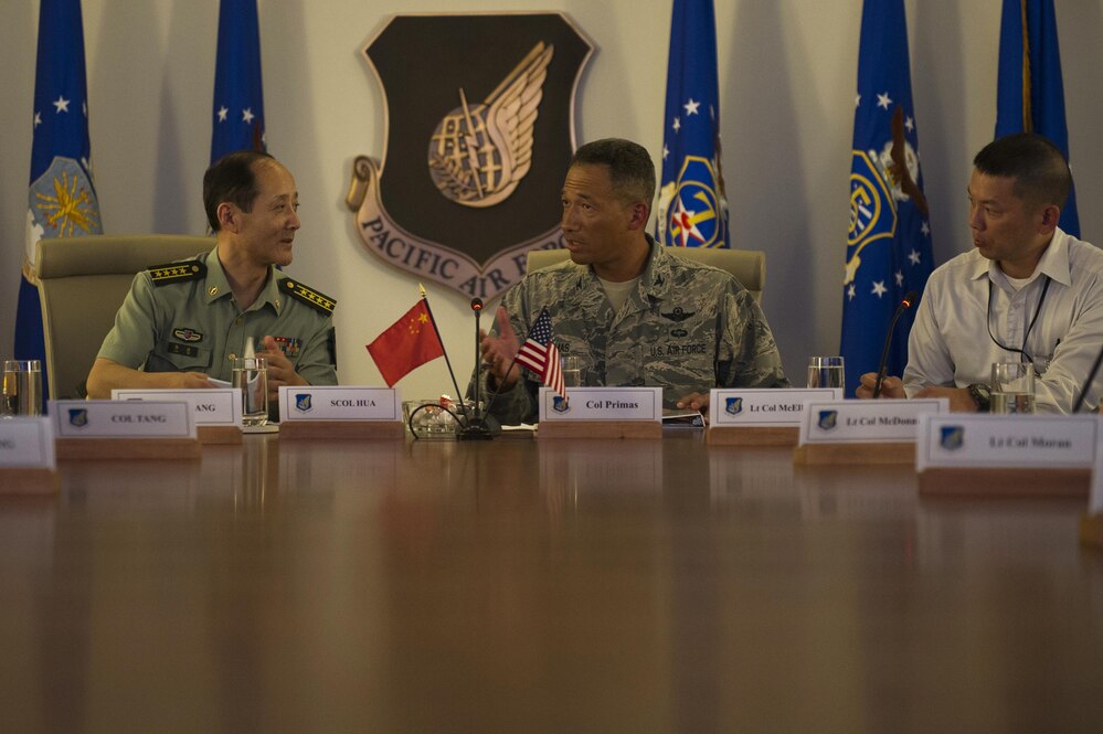 People's Liberation Army Senior Col. Hua Bo and U.S. Air Force Col. Art Primas, Pacific Air Forces International Affairs division chief, speak during a mid-level officer exchange at Joint Base Pearl Harbor-Hickam, Hawaii, Oct. 18, 2016. The PLA delegation visited PACAF as part of an annual exchange tour that included a stop at U.S. Pacific Command. (U.S. Air Force photo by Staff Sgt. Alexander Martinez)