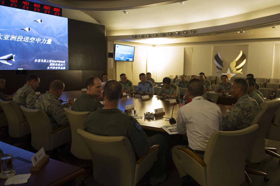 People's Liberation Army Senior Col. Hua Bo and U.S. Air Force Col. Art Primas, Pacific Air Forces International Affairs division chief, speak during a mid-level officer exchange at Joint Base Pearl Harbor-Hickam, Hawaii, Oct. 18, 2016. The PLA delegation visited PACAF as part of an annual exchange tour that included a stop at U.S. Pacific Command. (U.S. Air Force photo by Staff Sgt. Alexander Martinez)