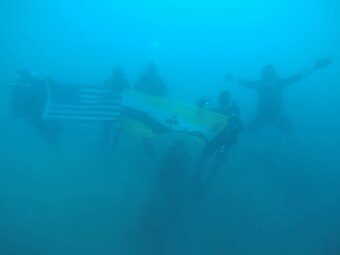 U.S. Navy Divers attached to Mobile Diving & Salvage Company ONE divers serving with the Royal Brunei Armed Forces gather for a group photo at the wreckage site of USS Salute (AM-294), which sank in Brunei waters on June 7, 1945, during Cooperation Afloat Readiness and Training (CARAT) Brunei 2016, Nov. 15. CARAT is a series of annual maritime exercises between the U.S. Navy, U.S. Marine Corps and the armed forces of nine partner nations to include Bangladesh, Brunei, Cambodia, Indonesia, Malaysia, the Philippines, Singapore, Thailand, and Timor-Leste.