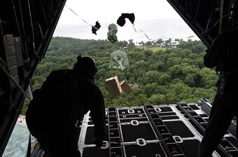 Staff Sgt. Andrew Thompson and Airman 1st Class Alejandra Vargas, loadmasters from the 36th Airlift Squadron, Yokota Air Base, Japan, push boxes of gifts off a C-130 Hercules over a remote Micronesian island during Operation Christmas Drop Dec. 8, 2016. This year marks 65 years of Operation Christmas Drop, a humanitarian airlift operation, which provides joint airlift training opportunities for both peace and wartime efforts.