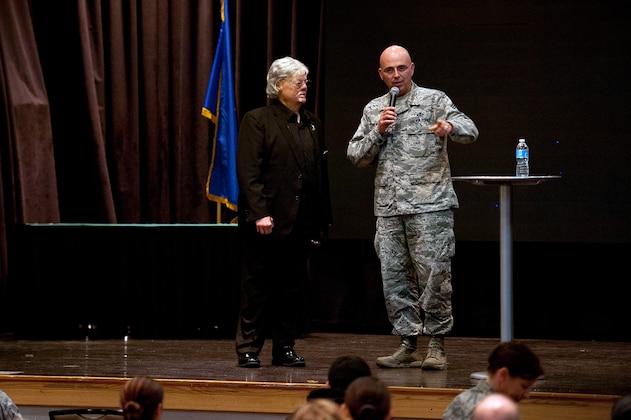 U.S. Air Force Chief Master Sgt. Alexander Del Valle, 51st Fighter Wing command chief, thanks Dave Roever, a Vietnam War veteran, for speaking about resiliency at Osan Air Base, Republic of Korea, Jan. 25, 2017. Roever, is an inspirational speaker who shares his story about how he survived after suffering burns all over his body when a phosphorus grenade exploded in his hand during the war.