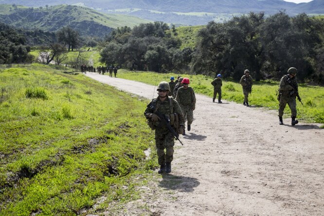 Japan Ground Self Defense Force soldiers with the Western Army Infantry Regiment conduct a squad movement during a live fire training event as apart of Exercise Iron Fist, aboard Marine Corps Base Camp Pendleton, California, Feb. 13, 2017. During the live fire, Japanese soldiers moved as a squad while facing simulated enemy forces. Iron Fist is an annual, bilateral training exercise where U.S. and Japanese service members train together and share techniques, tactics and procedures to improve their combined operational capabilities.