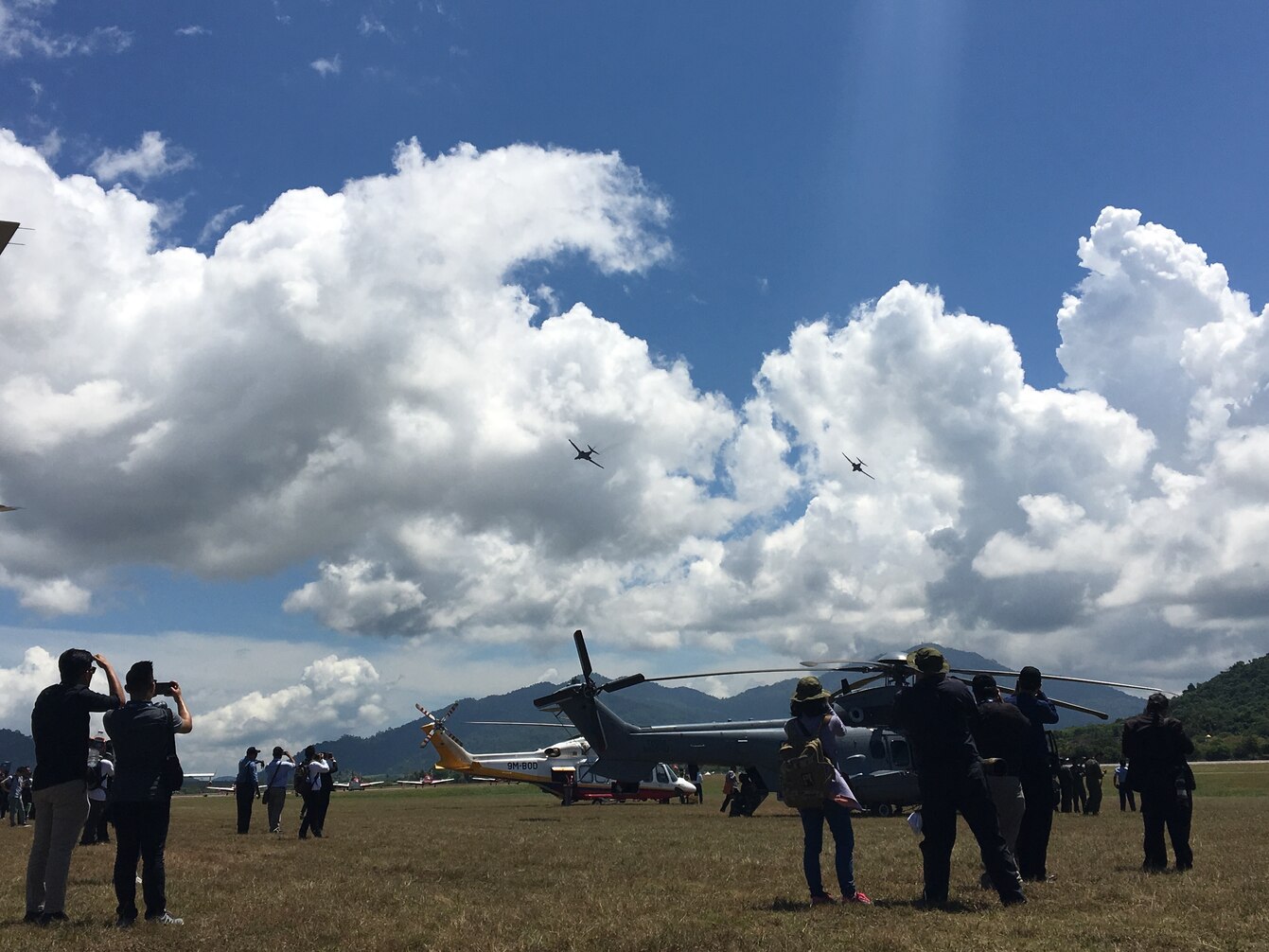 Two U.S. Air Force B-1B Lancer bomber aircraft with the 7th Bomb Wing, 9th Expeditionary Bomb Squadron from Dyess Air Force Base, Texas, currently deployed to Andersen Air Force Base in Guam, conduct a flyover during Langkawi International Maritime and Aerospace Exhibition (LIMA) 2017, Langkawi Island, Malaysia, March 21, 2017. LIMA is the premier aerospace and maritime exhibition in Malaysia. The biennial event helps grow military-to-military relationship between participants. The B-1 is a highly versatile, multi-mission weapon system that can rapidly deliver massive quantities of precision and non-precision weapons against any adversary. The B-1 is a key component to improving both joint service and ally interoperability. The rotation of this aircraft supports U.S. Pacific Command’s Continuous Bomber Presence, and is specifically designed to demonstrate the commitment of the U.S. to the Indo-Asia-Pacific region and regional security. (U.S. Air Force photo by Capt. Jessica Clark)