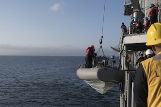 Sailors deploy a rigid-hull inflatable boat (RHIB) from the Ticonderoga-class guided-missile cruiser USS Lake Erie (CG 70), May 11, 2017. Lake Erie is currently underway on an independent deployment to the U.S. 7th and 5th fleet areas of operation in support of maritime security operations and theater cooperation efforts.