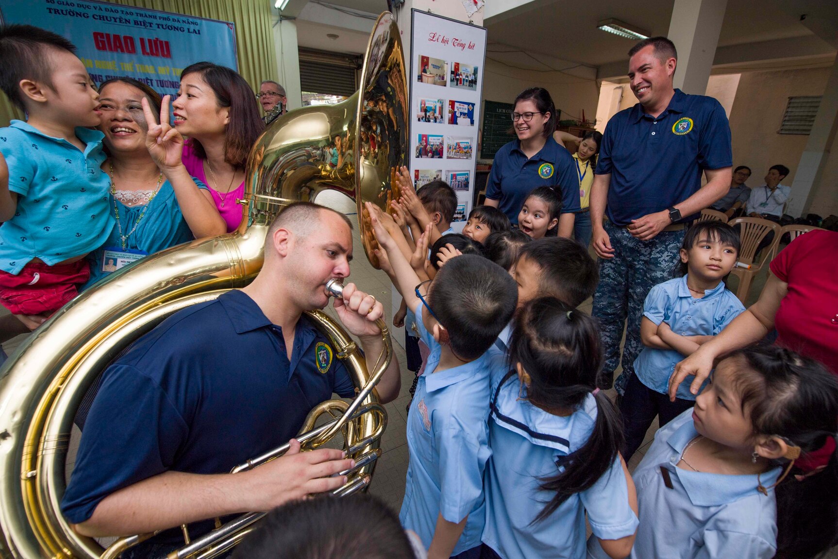 Musician 2nd Class James Brownell of the U.S. 7th Fleet Band plays the tuba for hearing impaired students to feel the sound vibrations with their hands during a community engagement at Tuong Lai Specialized School, May 10, 2017. Pacific Partnership is the largest annual multilateral humanitarian assistance and disaster relief preparedness mission conducted in the Indo-Asia-Pacific and aims to enhance regional coordination in such as medical readiness and preparedness for manmade and natural disasters.