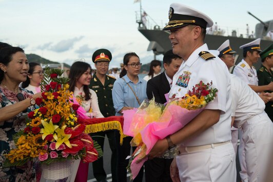 Capt. Stanfield Chien receives a welcoming gift from a People's Committee representative during the opening ceremony for Pacific Partnership 2017 Khanh Hoa, May 20, 2017. Pacific Partnership is the largest annual multilateral humanitarian assistance and disaster relief preparedness mission conducted in the Indo-Asia-Pacific and aims to enhance regional coordination in such as medical readiness and preparedness for manmade and natural disasters.