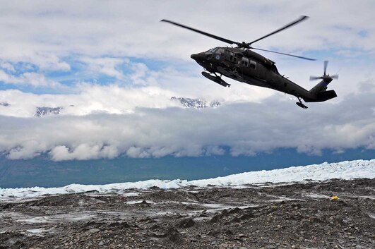 An Alaska Army National Guard UH-60 Black Hawk helicopter lands on top of Colony Glacier near Anchorage, Alaska to pick up personnel as part of Operation Colony Glacier. The operation is a mission to recover human remains and remove debris from a 1952 crash of a U.S. Air Force C-124 Globemaster II on the glacier with 52 service members on board. The recovery effort has taken place every summer since 2012 by personnel from Alaskan Command, the Alaska National Guard, Air Force Mortuary Affairs Operations, U.S. Army Alaska, 673d Air Base Wing, 3d Wing and Detachment 1, 66 Training Squadron.