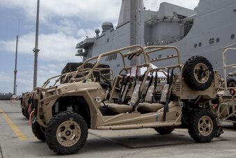 An MRZR Tactical Warfighting all-terrain vehicle belonging to the 31st Marine Expeditionary Unit sits pier side at White Beach Naval Facility, Okinawa, Japan, June 7, 2017. The 31st MEU partners with the Navy’s Amphibious Squadron 11 to form the Bonhomme Richard Expeditionary Strike Group – a cohesive blue-green team capable of accomplishing a variety of missions across the Indo-Asia-Pacific.