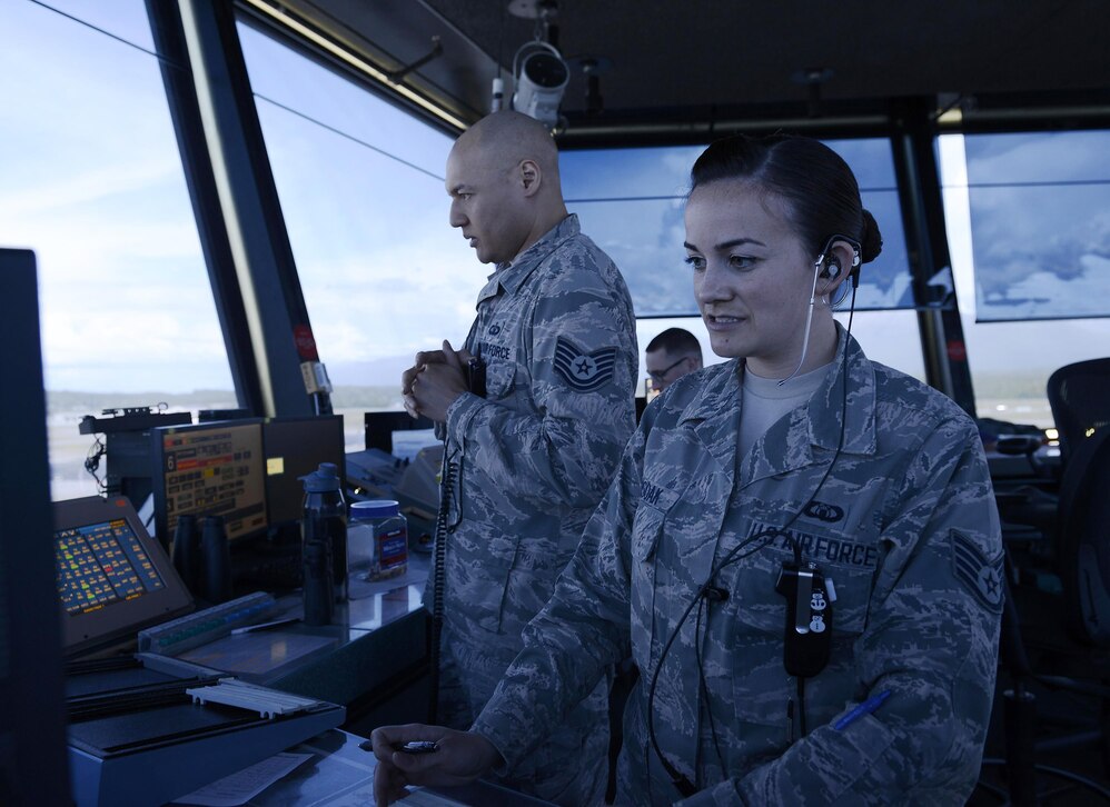 U.S. Air Force Staff Sgt. Amanda Ahsoak, air traffic control journeyman, and Tech. Sgt. Jason McLean, air traffic control tower watch supervisor, give direction to an inbound aircraft, Joint Base Elmendorf-Richardson, Alaska, June 15, 2017. ATC Airmen are responsible for the safety and control of hundreds of military and civilian aircraft every day.