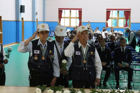 Korean War veterans lay wreaths and pay respect, June 16, 2017, to the 42 brothers who fell at Hill 303 during a ceremony held at Seok-Jeon Middle School in Waegwan, South Korea.