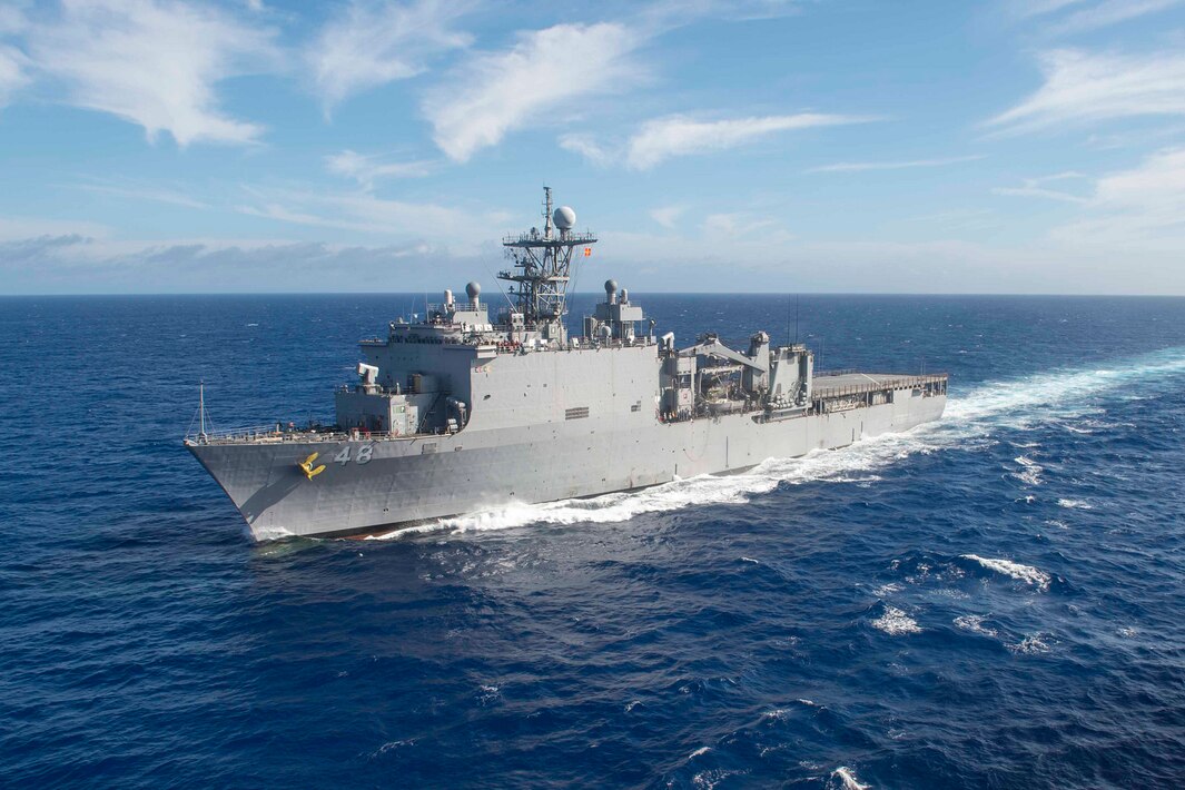 The amphibious dock landing ship USS Ashland (LSD 48) approaches the starboard side of the forward-deployed amphibious assault ship USS Bonhomme Richard (LHD 6) for replenishment at sea, June 5, 2017. Bonhomme Richard is the lead ship of the Bonhomme Richard Amphibious Ready Group (BHRARG), comprised of USS Green Bay (LPD 20), USS Ashland (LSD 48) and embarked 31st Marine Expeditionary Unit (31st MEU), assigned to the U.S. 7th Fleet area of operations supporting security and stability in the Indo-Asia-Pacific region.