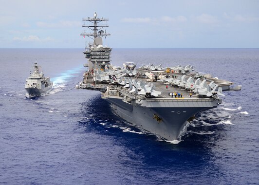 The aircraft carrier USS Nimitz (CVN 68) conducts a replenishment-at-sea with the Royal New Zealand Navy frigate HMNZS Te Kaha (F77), July 2, 2017. Sailors from Te Kaha and Carrier Strike Group (CSG) 11 are conducting a series of bilateral training operations designed to increase interoperability and readiness.