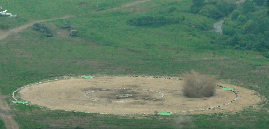 Inert weapons dropped from U.S. Air Force B-1B Lancers practicing attack capabilities impact the Pilsung Range, July 7. The Lancers are assigned to the 9th Expeditionary Bomb Squadron, deployed from Dyess Air Force Base, Texas, and took off from Andersen Air Force Base, Guam to conduct a sequenced bilateral mission with South Korean F-15 and Koku Jieitai (Japan Air Self-Defense Force) F-2 fighter jets, July 7. The bombers hit their target on time despite inclement weather, showcasing the combined air forces’ ability to overcome the elements. The mission is in response to a series of increasingly escalatory action by North Korea, including a launch of an intercontinental ballistic missile (ICBM) on July 3. (U.S. Army photo by Staff Sgt. Steven Schneider)