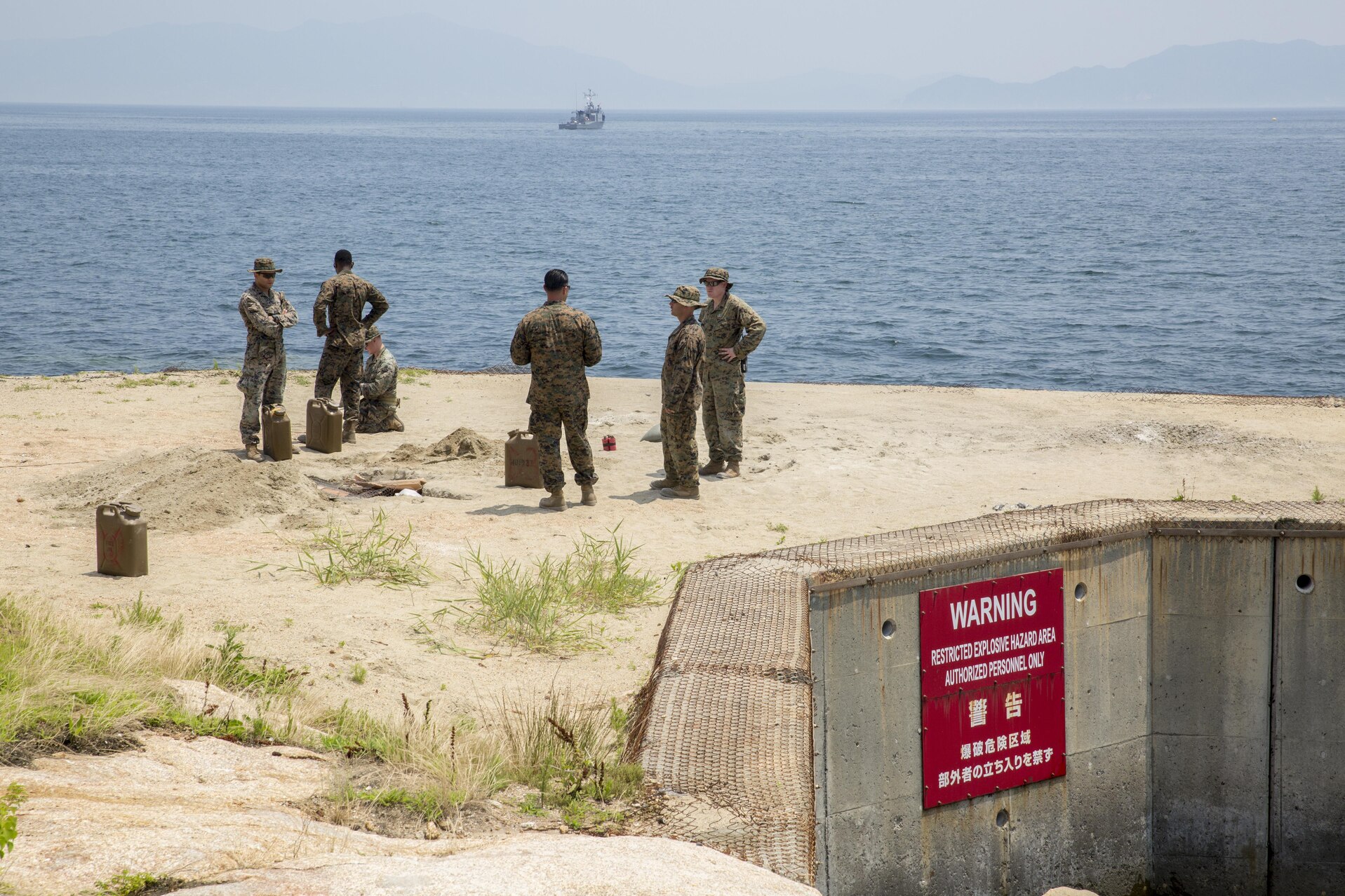 Explosive ordnance disposal Marines with Headquarters and Headquarters Squadron prepare to conduct a simulated gasoline explosion at Target Island, Marine Corps Air Station Iwakuni, Japan, July 14, 2017. The training allows the Marines to prepare for unexpected aircraft calamities or gasoline bomb explosions. (U.S Marine Corps photo by Lance Cpl. Carlos Jimenez)