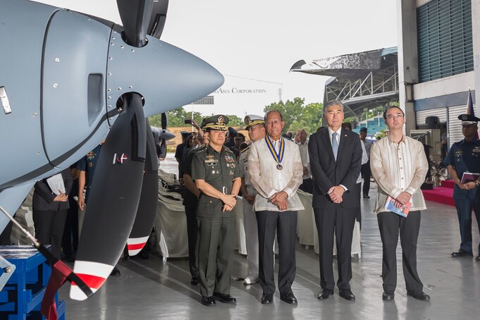 Chief of Staff of the Armed Forces of the Philippines General Eduardo Año, Secretary of National Defense Delfin Lorenzana, U.S. Ambassador to the Philippines Sung Y. Kim, and Secretary of Foreign Affairs Alan Peter Cayetano at the turnover and blessing ceremony for two new Cessna 208B aircraft from the U.S. to the Philippine Air Force at Villamor Air Base in Pasay City.
