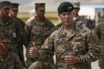 U.S. Army Lt. Gen Bryan P. Fenton speaks to U.S. Armed Forces service members at the closing ceremony of Exercise Khaan Quest 2017 at Five Hills Training Area, Mongolia, August 5, 2017. Khaan Quest 2017 is a Mongolian-hosted, combined, joint training exercise designed to strengthen the capabilities of the U.S., Mongolia and other partner nations in international peacekeeping operations.